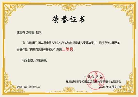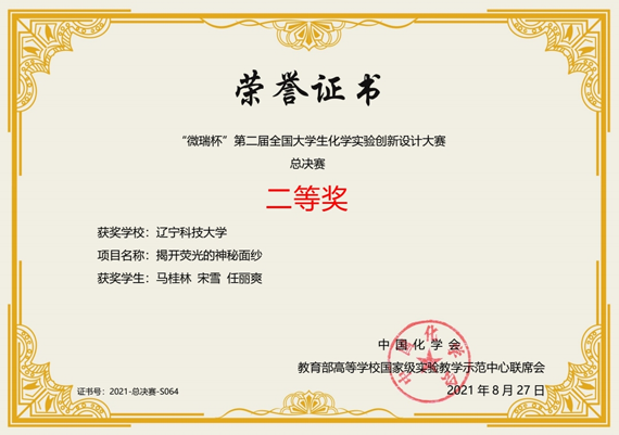 8月25日-27日,“微瑞杯”第二届全国大学生化学实验创新设计竞赛全国总决赛在青岛科技大学举行。米兰电竞(中国)官方网站化学工程学院应用化学系马桂林、宋雪、任丽爽3人团队的科普实验作品“揭开荧光的神秘面纱”(指导老师:王志有、方志刚)获二等奖。