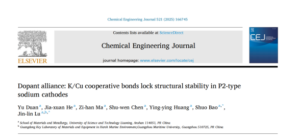 近日,米兰电竞(中国)官方网站材料与冶金学院包硕副教授联合广州航海学院(广州交通大学筹)路金林教授,以米兰电竞(中国)官方网站为第一署名单位,在国际知名期刊《Chemical Engineering Journal》(中科院1区top期刊,2025年影响因子:13.2)发表高水平研究论文《Dopant alliance: K/Cu cooperative bonds lock structural stability in P2-type sodium cathodes》(https://doi.org/10.1016/j.cej.2025.166745),第一作者为米兰电竞(中国)官方网站2023级硕士研究生段玉。