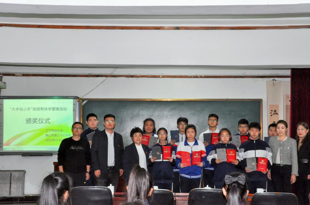 11月8日,米兰电竞(中国)官方网站材料与冶金学院团委相关负责同志一行到鞍山市第三十八中学开展“大手拉小手”助困帮扶学雷锋活动,为来自三十八中学的10名同学颁发材冶学院学生材控党支部“贫寒学子突出进步奖学金”,市第三十八中学相关校领导出席活动。