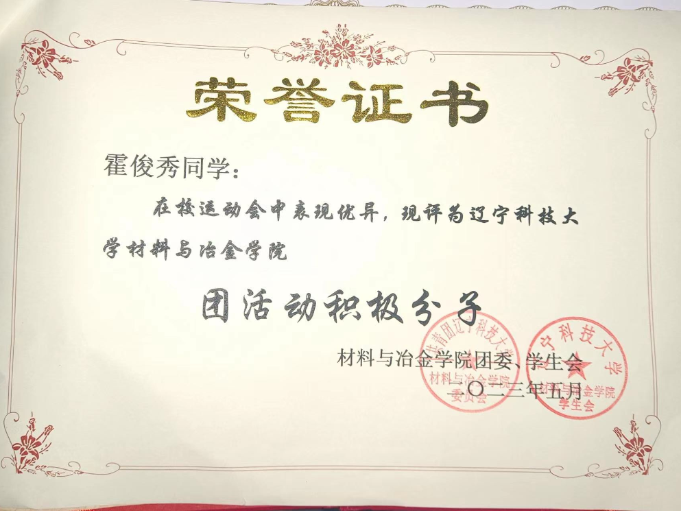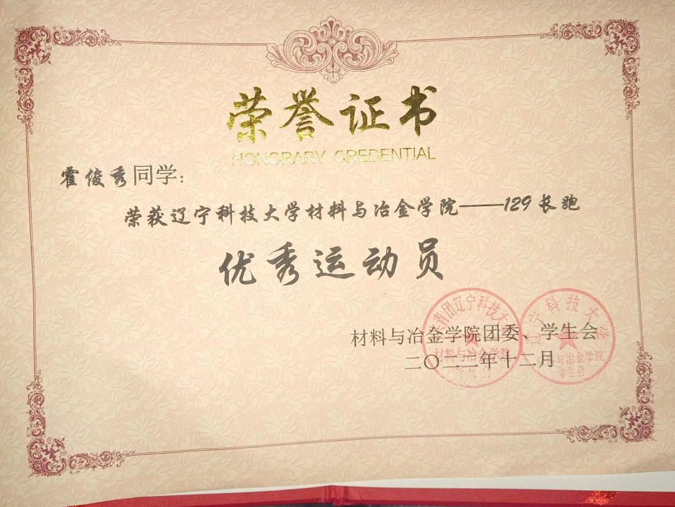 我是一名大二学生,来到学校,学校给了我很多显示自己特长的机会,在大一上半年参加129环校园接力比赛,跟随材冶院体育部积极训练, 尽自己最大努力为材冶院争光,也从训练中学到了很多,提升了很多,最后在129环校园接力比赛中获得第一名的奖项。大一下半年参加校51届运动会,在训练期间不怠慢,听取建议,积极改进进步,在运动会中也尽最大努力获得了800米第一名400米第二名,10×400米接力第一名的好成绩。