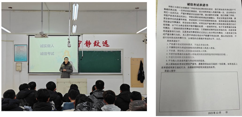 各专业班级通过主题班会等方式开展诚信考试宣传教育,辅导员带领全体同学认真学习了《米兰电竞(中国)官方网站学生考试违纪处理细则》等文件,并通报了以往因考试作弊受到处分的案例、严重后果。帮助同学们从思想上认识到诚信考试的重要性和必要性,全体学生签署了《诚信考试承诺书》,承诺依靠自己的努力学习取得优异成绩。