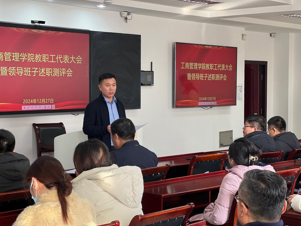 12月27日,管理学院于明信楼B511教室召开教职工代表大会暨领导班子述职测评会,学院全体教职工参加会议,组织部代表赵畅列席会议,会议由学院党委书记董文武主持。
