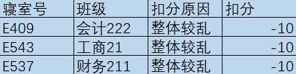 每周中午12:30,工商管理学院对全体本科生宿舍进行检查。在检查过程中发现大多数宿舍能够保持整体干净整洁,不乱扔垃圾,桌面摆放整齐,对这些优秀宿舍给予表扬。也有一些寝室内务卫生方面有待加强。现将检查结果公示如下: