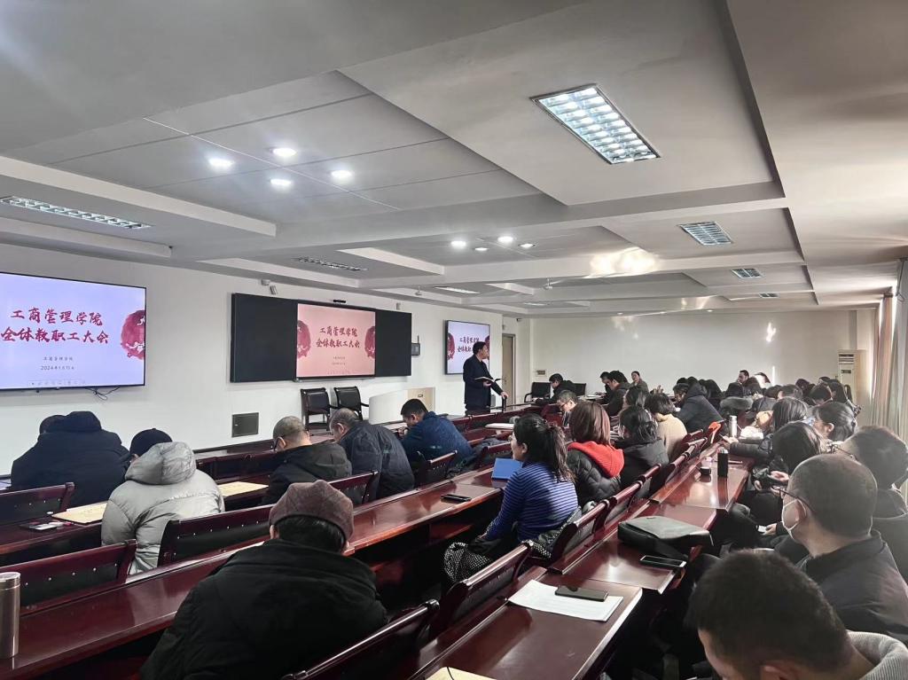 1月11日下午,工商管理学院在明信楼B513室召开全体教职工大会,总结2023年学院各项工作,对2024年重点工作进行规划部署,学院全体教职员工参加会议。
