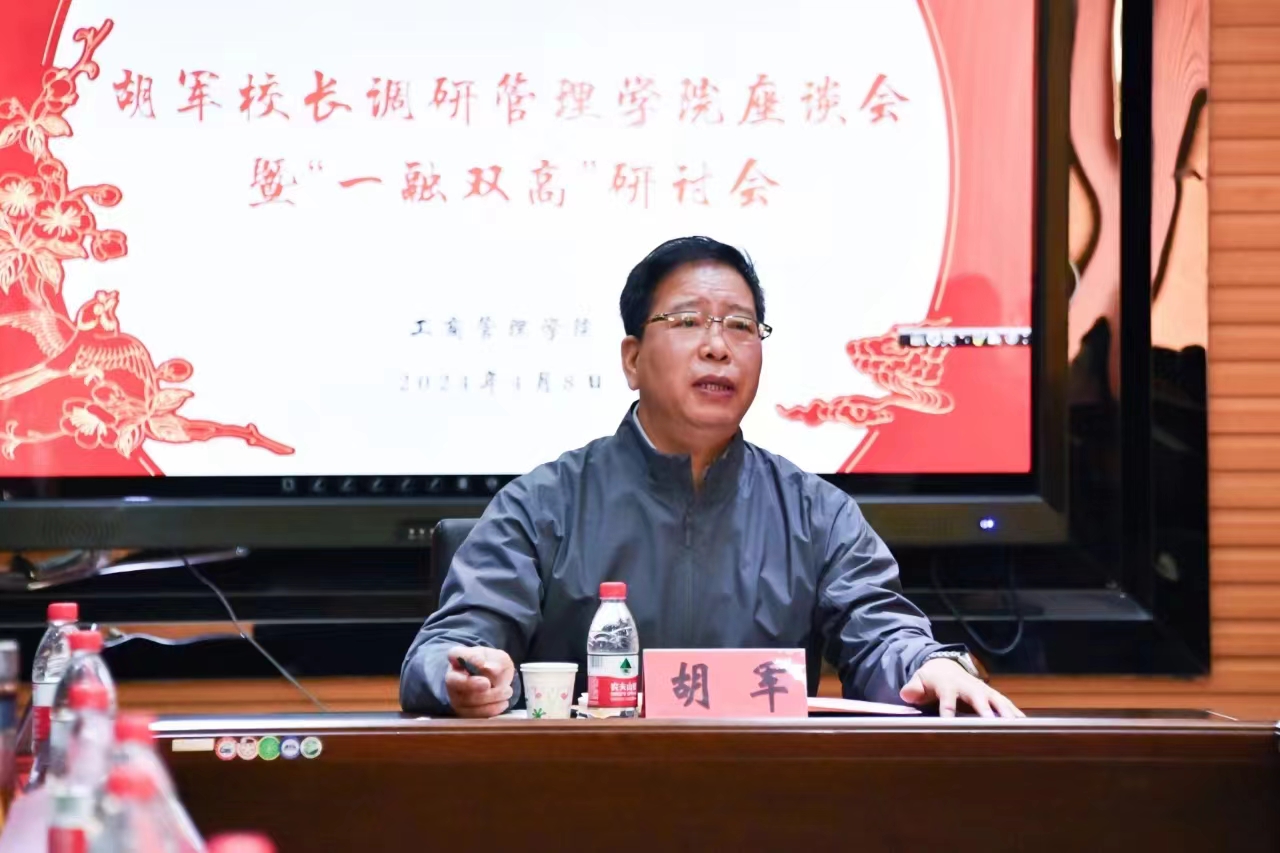 4月8日上午,米兰电竞(中国)官方网站工商管理学院召开“一融双高”专题研讨会。校党委副书记、校长胡军出席会议并讲话。管理学院领导班子成员、系室主任、党支部书记及科级以上干部参加研讨。