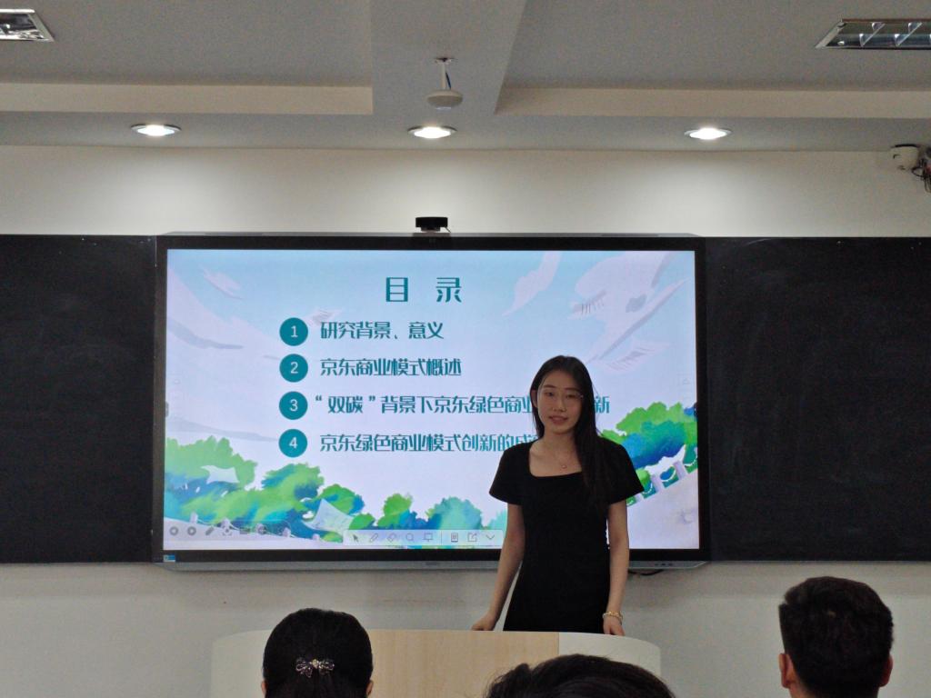 于峻苏的报告题目为《“双碳”背景下京东绿色商业模式创新研究》,她聚焦绿色商业模式,提出绿色商业模式不仅能减少能源消耗、降低环境污染和提高企业运营效率,还有助于提升企业形象。并引用京东作为经典案例,分析了京东在“双碳”背景下绿色商业模式的创新实践,指出京东不断以出色的绿色创新实践,给其他企业提供了示范作用,赢得了社会各界的广泛认可。