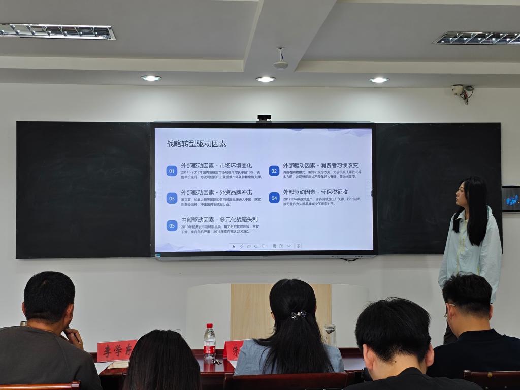 赵春阳的汇报题目为《战略转型对波司登集团财务绩效的影响研究》,她提出波司登集团专一化战略转型是成功的,但是随着转型时间的推进,波司登集团在经营中表现出了主品牌增长放缓,品牌定价与品牌度失衡、库存周转天数上升等问题,针对这些问题报告也提出了相应的改进对策为波司登集团在提升财务绩效方面提供良好思路,也为即将开展战略转型的企业提供一些借鉴。