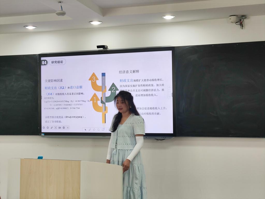 张斓曦同学的研究题目是:《中国税收收入影响因素分析》。她聚焦税收对国家财政及经济发展的关键作用,系统梳理经济增长、财政支出、产业结构等多方面影响因素,基于2005-2020年数据构建计量模型,通过多元线性回归与逐步检验,揭示财政支出和进口总额对税收收入的显著正向影响。论文还从产业结构调整、税收优惠政策等方面提出对策建议,为相关部门把握税收变化趋势、优化政策提供了重要参考。