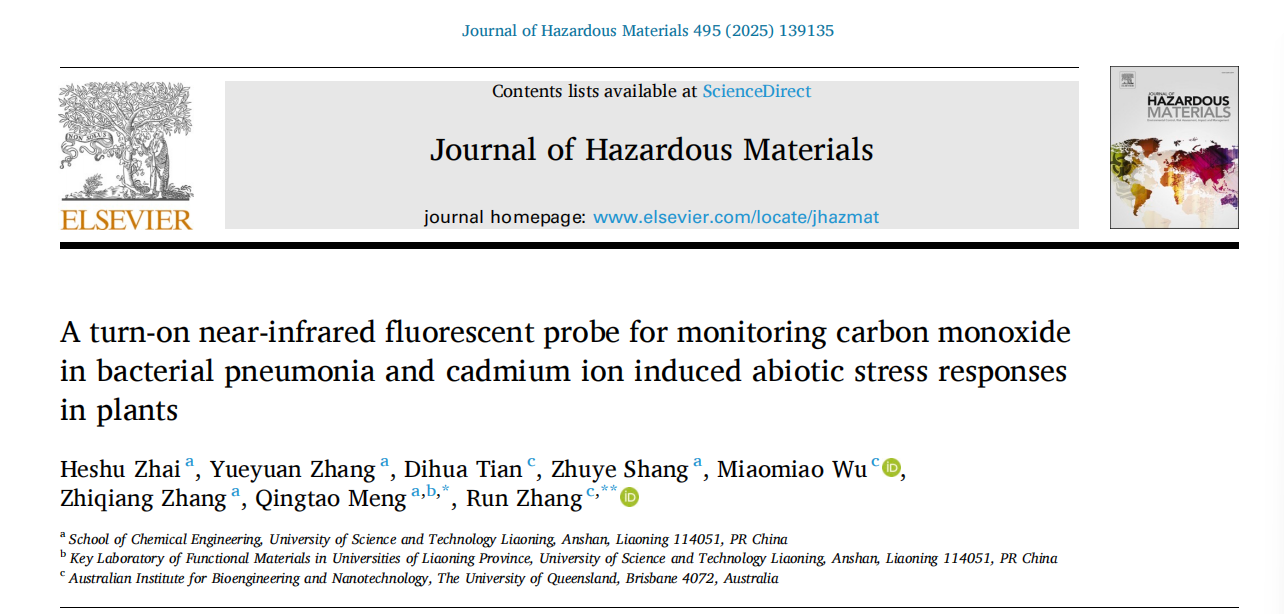 近日,米兰电竞(中国)官方网站化学工程学院在新型近红外荧光探针用于同步追踪一氧化碳(CO)在动物炎症(细菌性肺炎)和植物重金属胁迫(镉毒害)过程中的动态行为取得重要进展,突破性实现单探针跨物种应用。研究成果以《A turn-on near-infrared fluorescent probe for monitoring carbon monoxide in bacterial pneumonia and cadmium ion induced abiotic stress responses in plants》为题发表于环境科学与生态学领域国际顶级期刊《Journal of Hazardous Materials》(中科院一区TOP期刊,IF=11.3)。论文第一作者为化学工程学院博士研究生翟鹤书,通讯作者为化学工程学院孟庆涛教授。