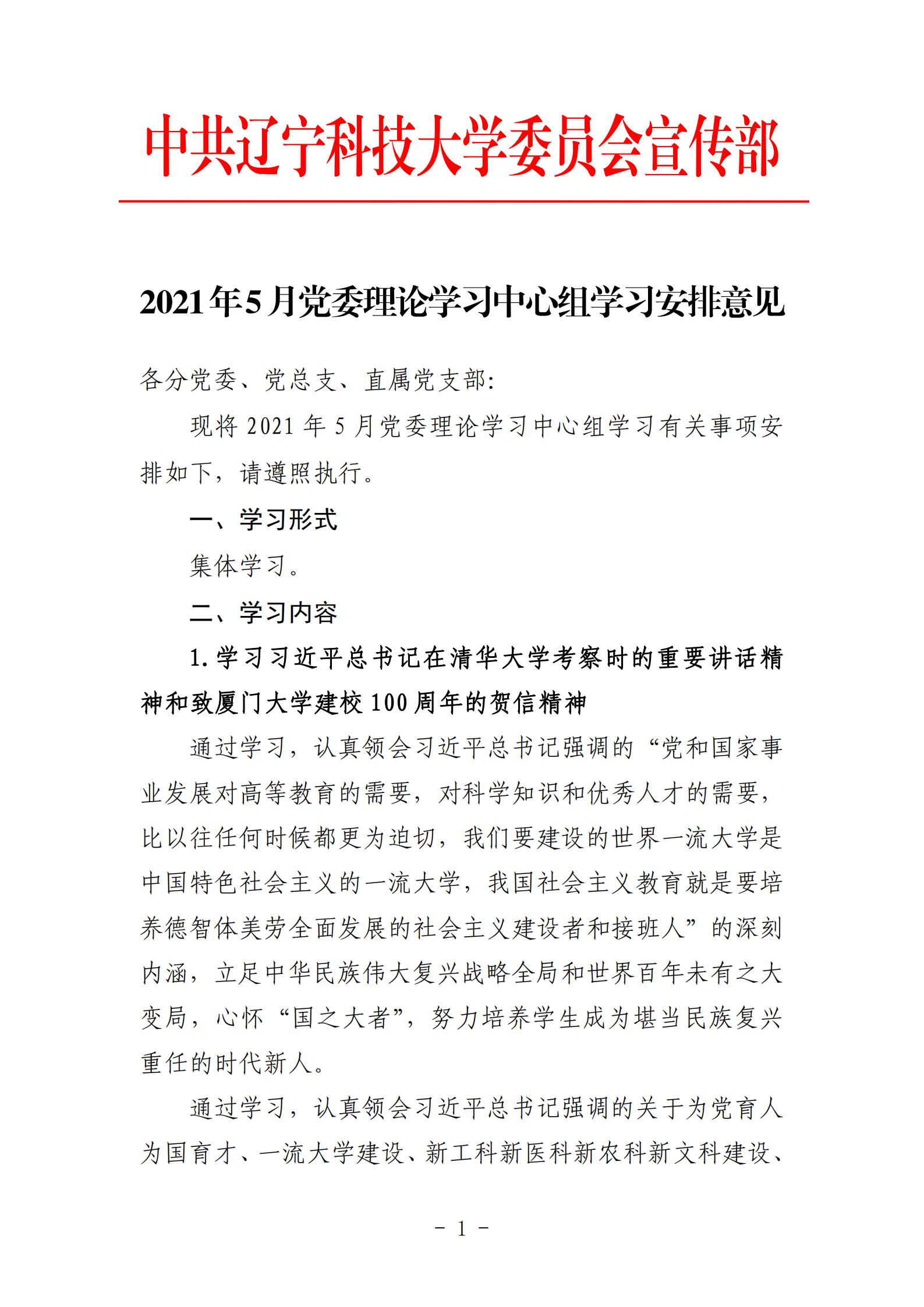 2021年5月党委理论学习中心组学习安排意见