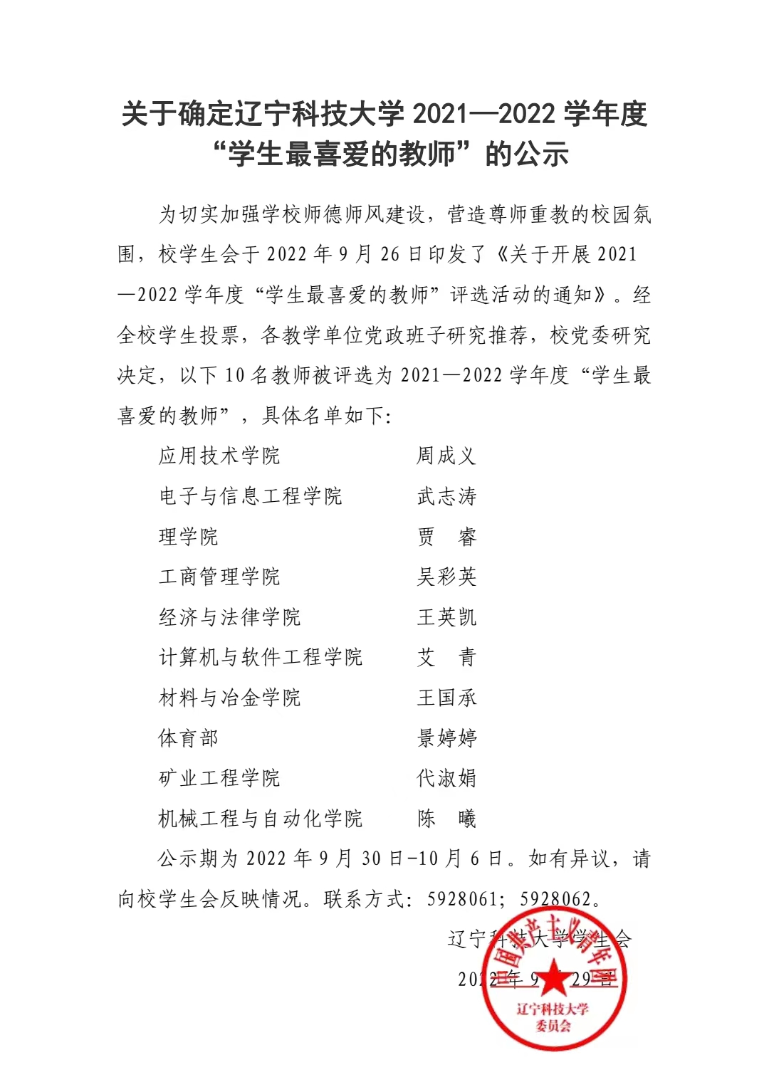 关于确定米兰电竞(中国)官方网站 2021—2022 学年度 “学生最喜爱的教师”的公示