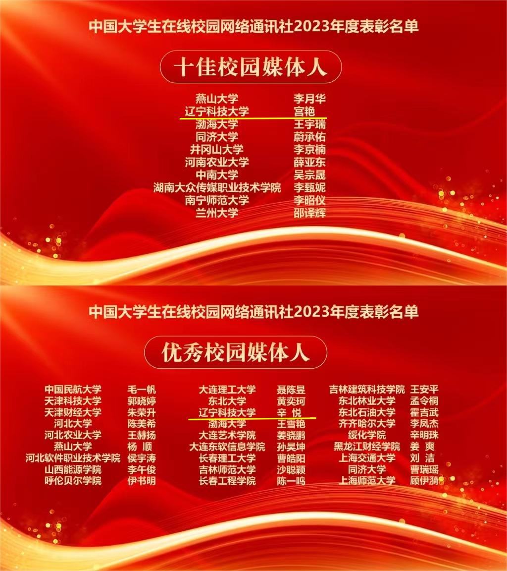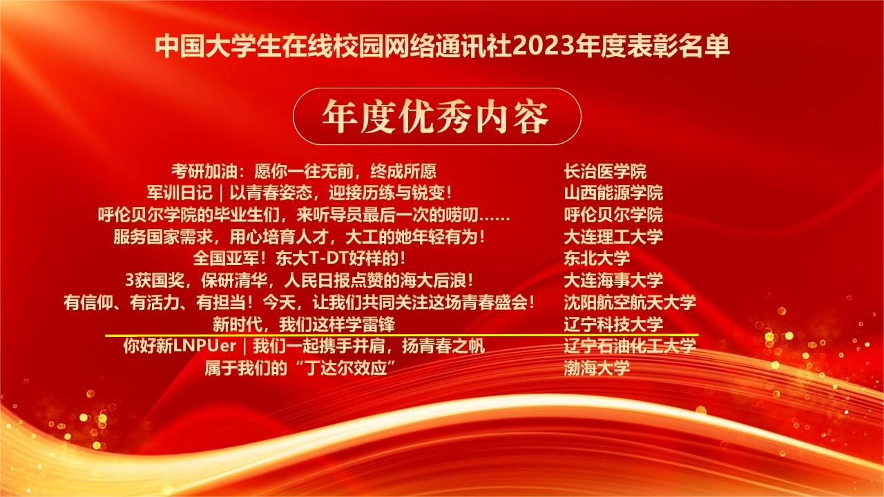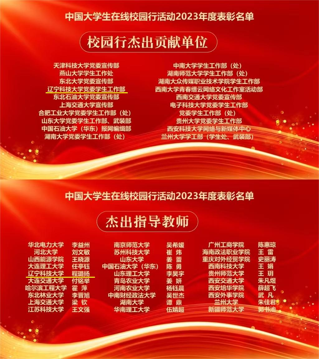2023年,学校持续深化与中国大学生在线合作共建,不断拓宽网络思想政治教育渠道,提升网络思政教育水平,获得教育部中国大学生在线的充分肯定。此次表彰中,米兰电竞(中国)官方网站党委学生工作部获评“校园行杰出贡献单位”,米兰电竞(中国)官方网站网通站获评教育部中国大学生在线“十佳校网通站”,程璐扬获评“校网通十佳指导教师”“校园行杰出指导教师”,校网通站学生宫艳获评“十佳校园媒体人”、辛悦获评“优秀校园媒体人”,“新时代,我们这样学雷锋”获评“年度优秀内容奖”。