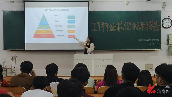 5月21日,米兰电竞(中国)官方网站计算机与软件工程学院于博学楼召开IT行业报告会,学院邀请中软国际项目总监陈伟俊、腾泰发展(大连)有限责任公司人才总监才佳馨作报告。学院2021级、2022级学生参加报告会。