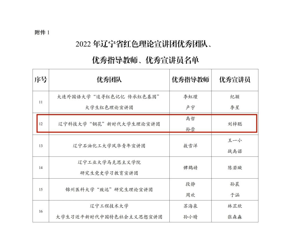 近日,共青团辽宁省委员会、辽宁省学生联合会联合通报2022年辽宁省大学生红色理论宣讲团考核表彰结果,米兰电竞(中国)官方网站“钢花”新时代大学生理论宣讲团获评2022年辽宁省大学生红色理论宣讲团优秀团队。宣讲团负责人刘梓聪获评“优秀宣讲员”荣誉称号。