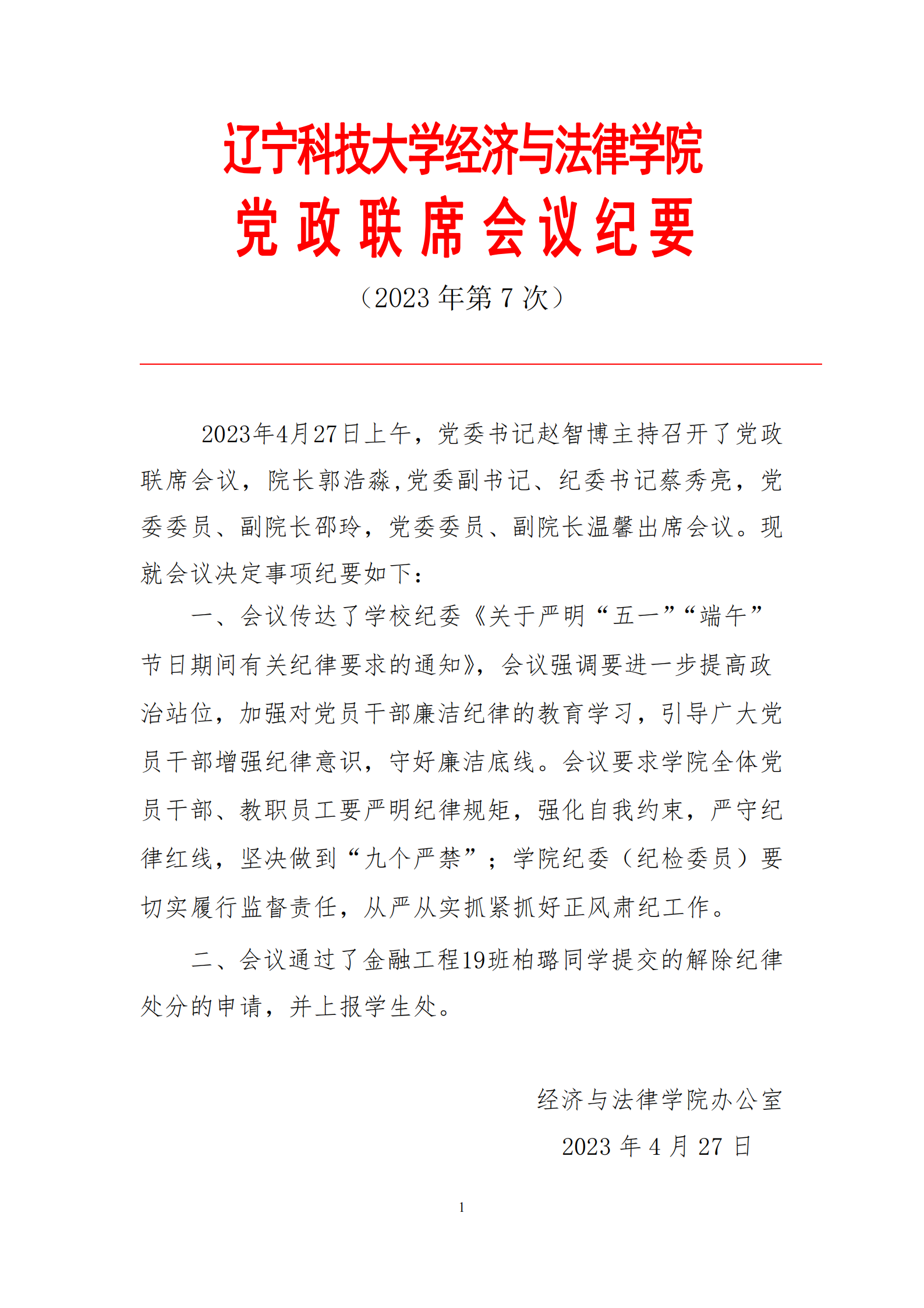 米兰电竞(中国)官方网站经济与法律学院党政联席会会议纪要(2023年第7次)