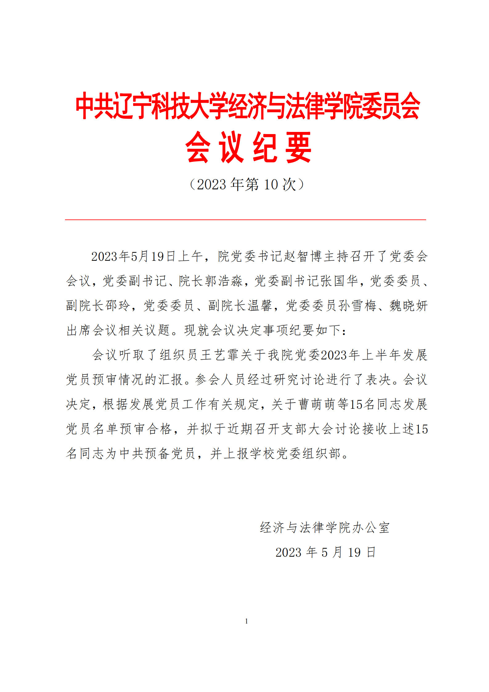 中共米兰电竞(中国)官方网站经济与法律学院委员会会议纪要(2023年第10次)