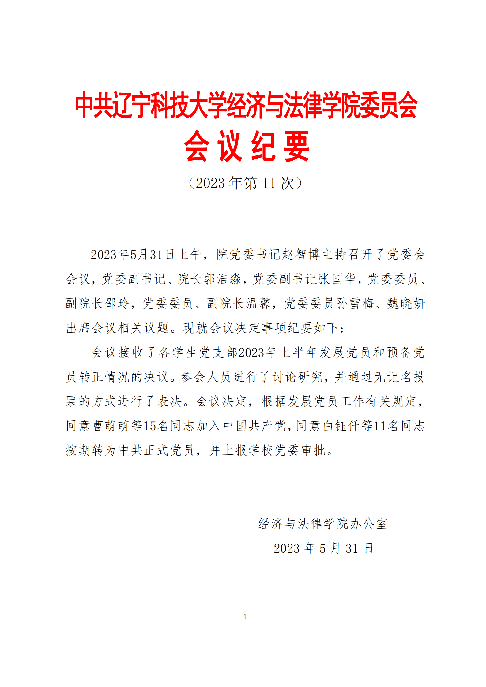 中共米兰电竞(中国)官方网站经济与法律学院委员会会议纪要(2023年第11次)
