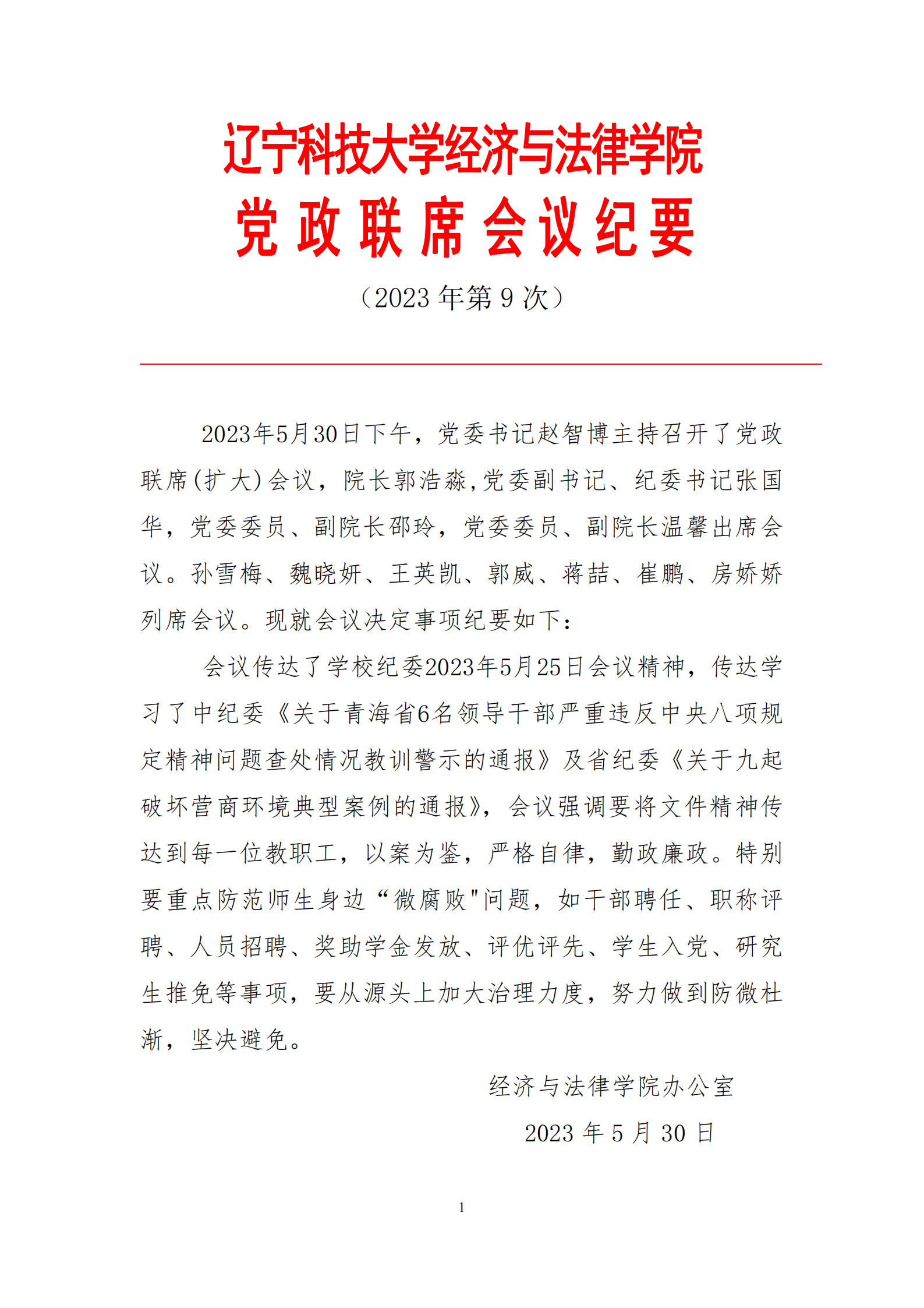 米兰电竞(中国)官方网站经济与法律学院党政联席会议纪要(2023年第9次)
