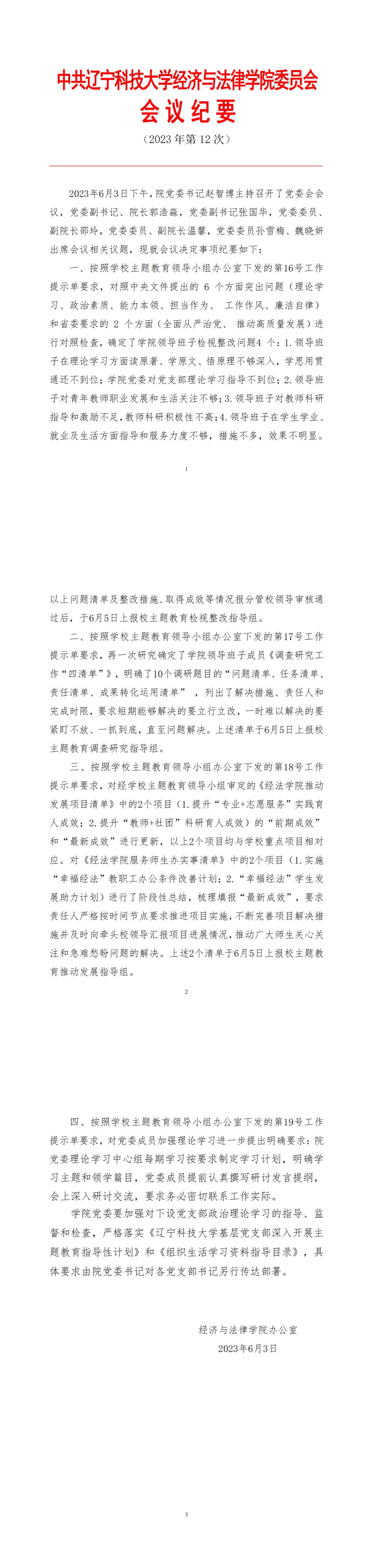 中共米兰电竞(中国)官方网站经济与法律学院委员会会议纪要(2023年第12次)