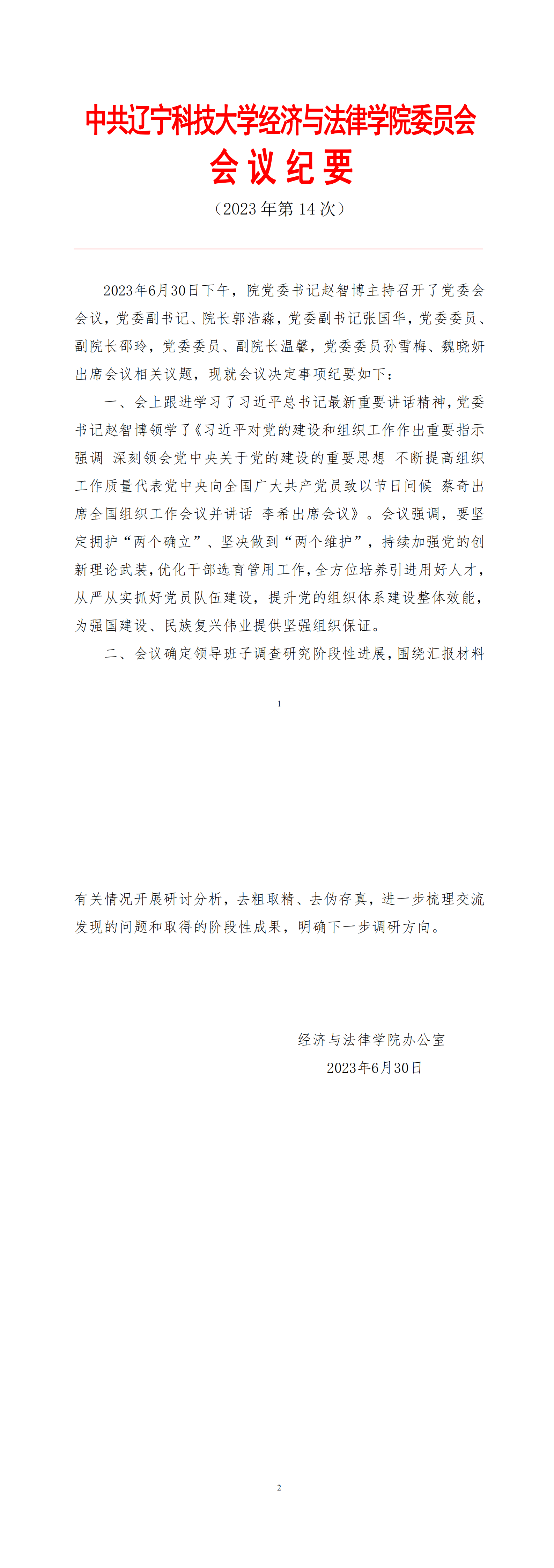 中共米兰电竞(中国)官方网站经济与法律学院委员会会议纪要(2023年第14次)