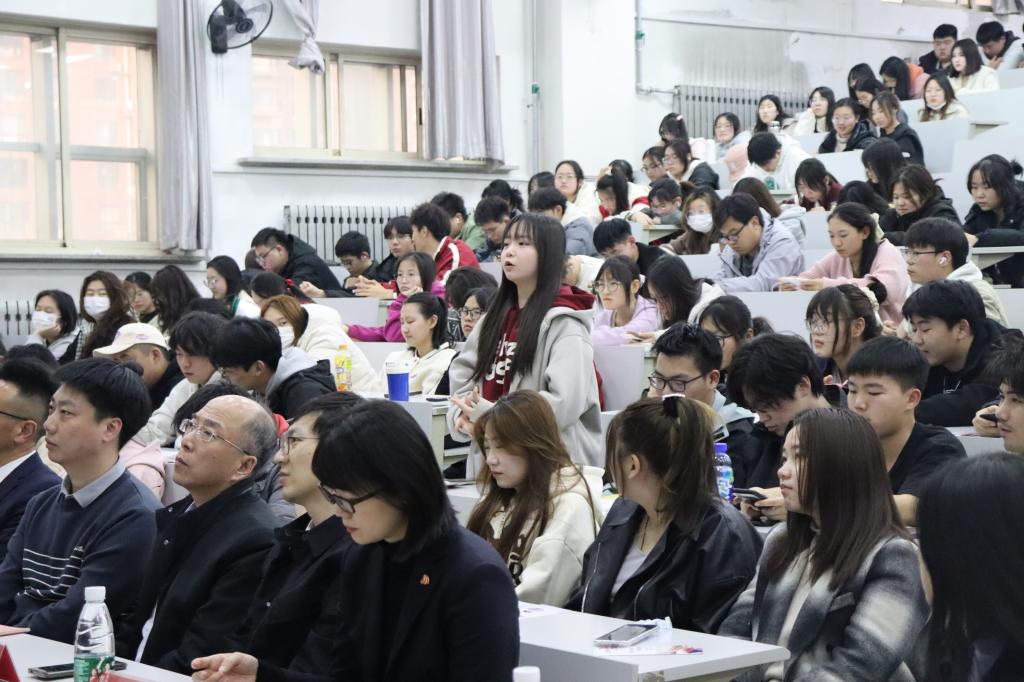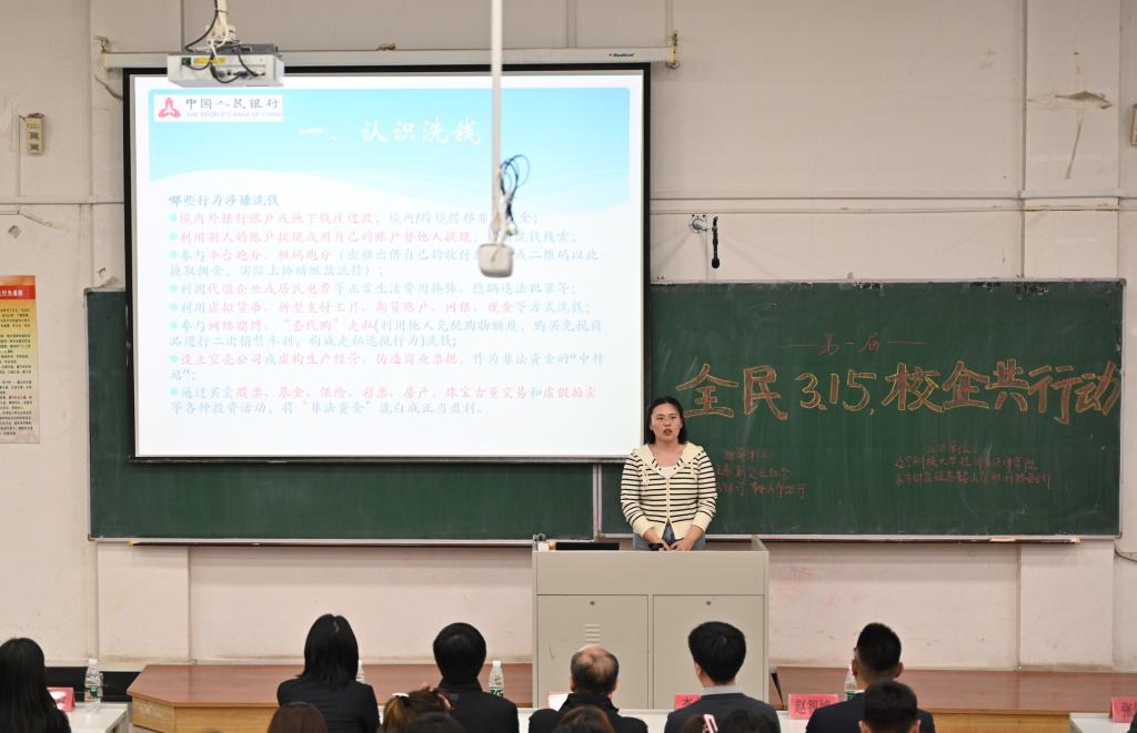 活动伊始,中国人民银行鞍山分行副行长刘纪首先致辞,随后由东方财富证券鞍山营业部工作人员姜英东作《走进基金的世界,开启我的第一堂基金课》主题宣讲。中国人民银行科员韩玮为同学们普及了反洗钱常识及对应的公民义务,带领大家了解到什么是洗钱、洗钱相关法律法规、洗钱的危害以及反洗钱监管体制等,并通过洗钱案例警示大家远离洗钱,勇于举报洗钱活动。随后易方达基金公司代表向同学们介绍了基金从业和职业生涯规划等方面的内容,并从自身出发,分享职业经历,让同学们对基金运行和基金市场产生了更直观、更深入的认识。讲解过后,同学们针对当前基金环境和未来发展方向提出了自己的困惑和想法,代表们给予了耐心且详细的解答。最后,学院党委书记赵智博作总结发言,他首先对各企方代表的到来表达了感谢,宣布由东方财富证券鞍山营业部携手米兰电竞(中国)官方网站经法学院举办的第一届“全民3.15,校企共行动”活动正式开启,并表示此次活动在指导大学生就业实践方面具有重要意义,鼓励同学们积极参与其中,同时期待未来校企继续携手与时俱进,协同育人,实现双向奔赴。
