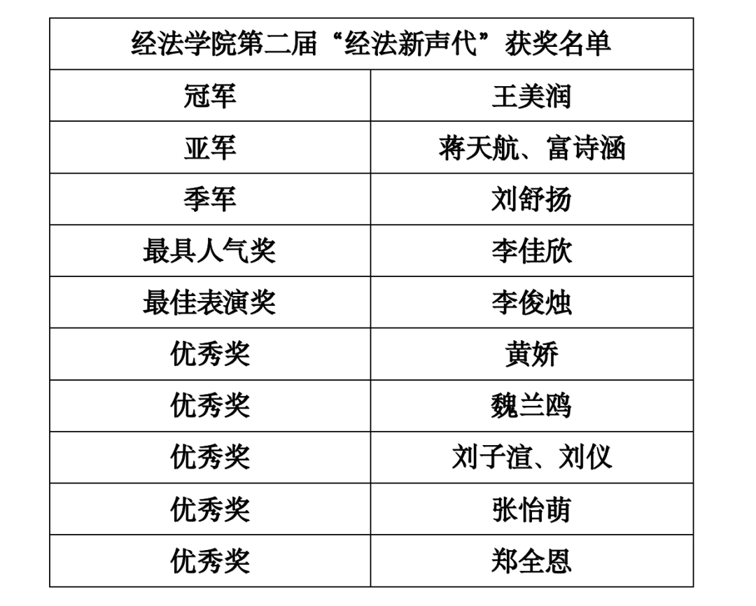 11月28日,经法学院于艺术馆举办第二届“经法新声代”歌唱比赛,经法学院团委副书记张鹏飞、学院团委、学生会各部门负责人以及各学院学生会文化活动部负责人出席并担任评委,经法学院2024级全体学生参加。