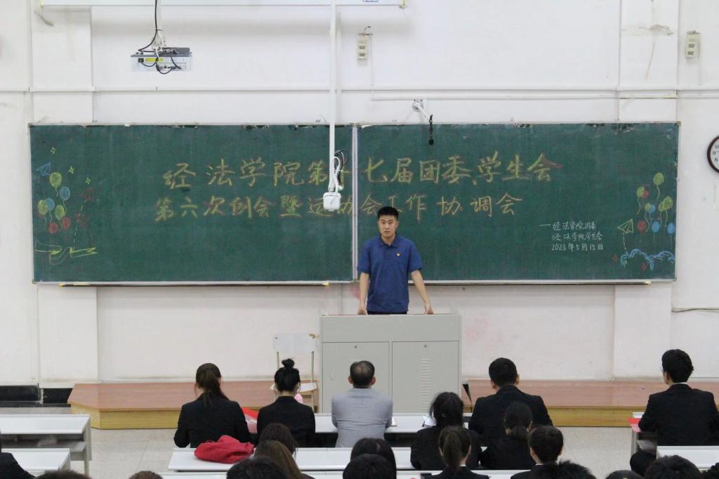 5月15日,经法学院于博学楼A301召开第十七届团委、学生会第六次例会暨运动会工作协调会,本次会议由经法学院团委副书记张鹏飞主持,学院党委副书记张国华、全体学生骨干以及全体运动员出席了本次会议。
