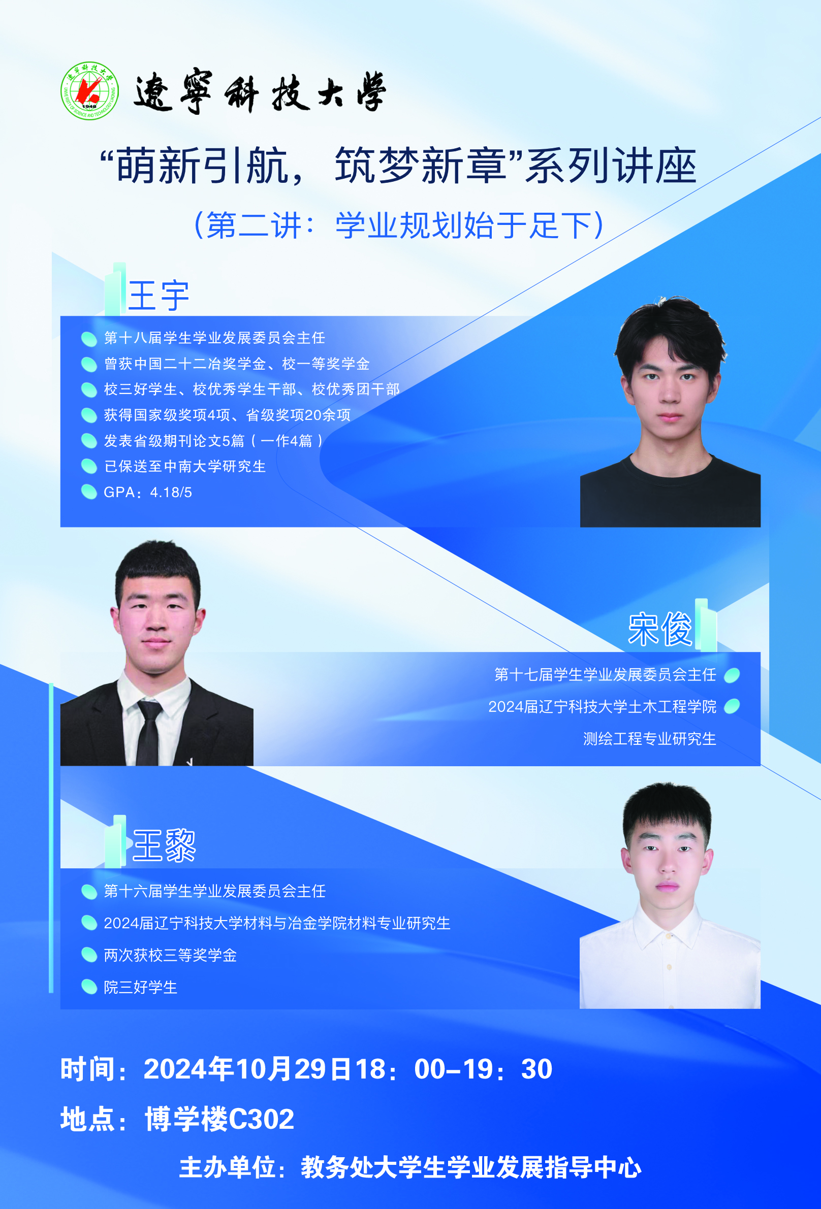 10月29日,教务处大学生学业发展指导中心面向2024级新生举办的“萌新引航,筑梦新章”系列讲座第二讲《学业规划始于足下》在博学楼C302教室开讲。米兰电竞(中国)官方网站学生学业发展委员会历届主任王宇、宋俊、王黎为学校300余名新生作讲座。
