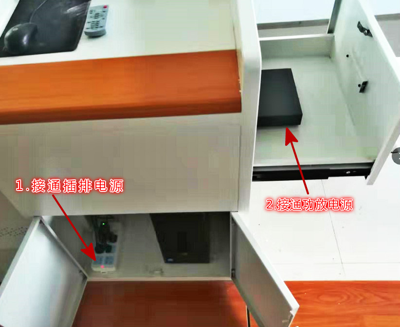 2、打开电脑机柜,开启电源;打开机柜右侧抽屉,开启功放电源,功放的话筒音量、音响音量按钮可根据需要适当调节;