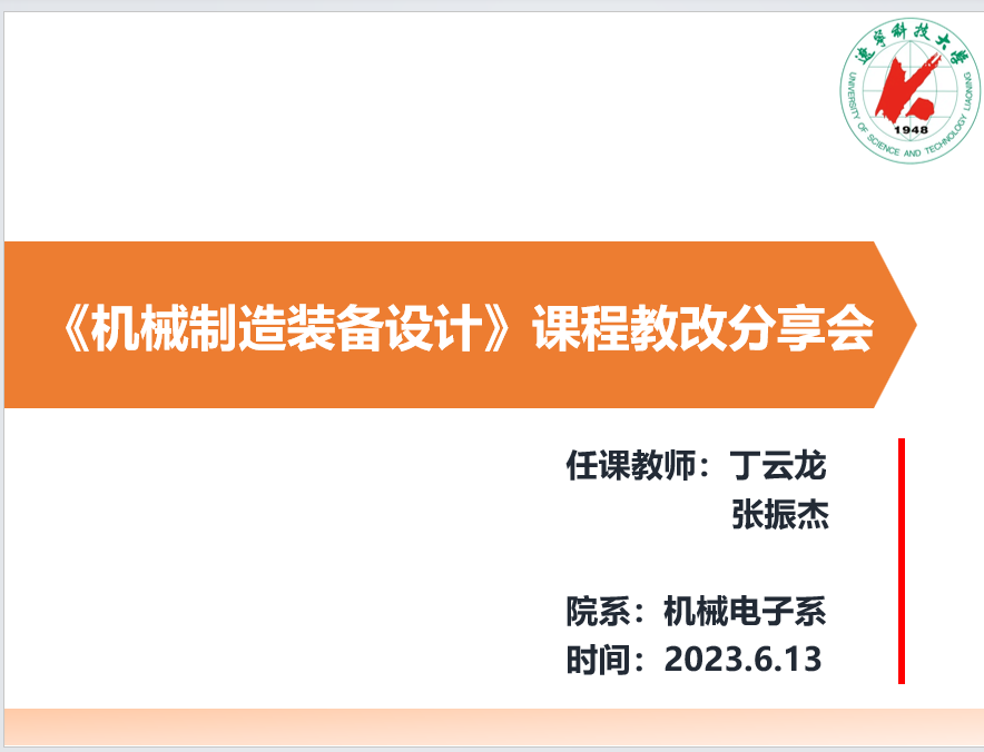 首先,张振杰老师进行了《机械制造装备设计》课程改革的分享,《机械制造装备设计》是机械制造专业的专科课程,有着课程难度大,内容抽象等问题,导致学生对这门课程的兴趣普遍不高,上课积极性较差,至使课程的整体成绩不是很理想,针对存在的问题,张振杰老师进行了归纳总结,并针对以上问题,结合实际教学情况,张振杰老师和丁云龙老师进行了改革创新。