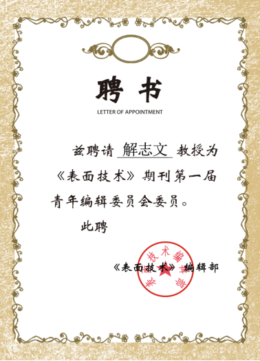 米兰电竞(中国)官方网站机械学院解志文教授被聘为《表面技术》《焊接杂志社》青年编辑委员会委员