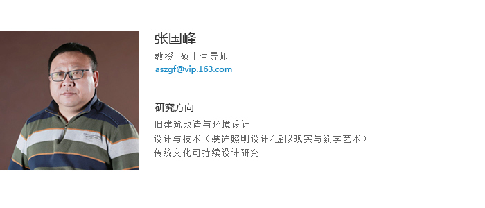 张国峰教授,1996年东北师范大学美术学院,教育学学士;2010年中央美术学院建筑学院,建筑与环境艺术设计研究,设计学硕士;2017年中央美术学院建筑学院,城市营造艺术与方法及其理论研究,设计学博士毕业。有跨多个学科的教育和工作背景,包括旧建筑改造设计、室内设计、虚拟现实与数字艺术、装饰照明设计、传统文化可持续设计研究、水彩绘画艺术创作。承担学院设计专业的主干课程教学工作,曾为多家设计公司和机构承担设计、管理与顾问服务,承担诸多设计项目,具有较丰富的设计实践与设计管理和研究经验。同时兼任中国照明学会装饰照明专业委员会专家副主任;北京照明学会环境艺术照明专业委员会委员;辽宁省土木建筑学会室内设计分会副理事长;辽宁省工程项目评标专家。获辽宁省教育厅教学成果奖1项;辽宁省社会科学基金项目3项;外观设计专利2项;出版教材3部,十二五省级规划教材1部;编著1部;发表论文10多篇,CSSCI检索3篇;指导学生设计作品获得国家级、省级一、二等奖多项。