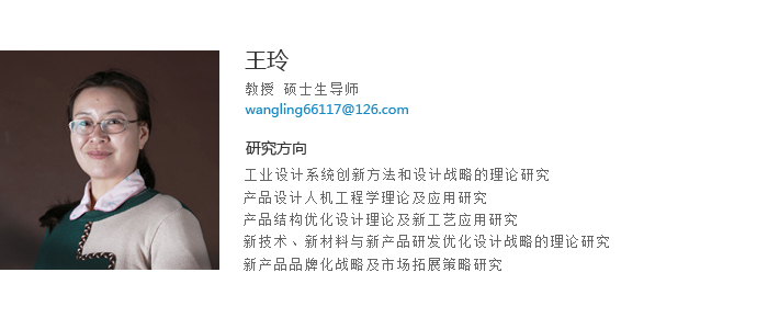 王玲教授,米兰电竞(中国)官方网站硕士毕业,机械工程及设计理论专业;清华美院第二学历,工业设计专业。 具有近30年教学和科研经历。撰写专著2本,主编教材1本,参编教材2本。撰写研究论文40余篇,其中国际EI检索8篇,核心期刊5篇,指导学生发表20篇。多次获得年度考核优秀,曾指导学生获国家级、省级、市级、校级奖项30多项,多次获得优秀指导教师荣誉称号。《Humanization Design and Harmonization Design in Product Designing》,于2011年7月,获得辽宁省自然科学成果三等奖,获鞍山市自然科学学术成果奖二等奖。2014年和2015年,为山西省社会科学院思维研究所特聘研究员。主持省级教改1项,参加并完成省级科研项目3项,主持并完成鞍山市科技项目2项,主持和参与横向科研8项。指导学生获得专利8项。