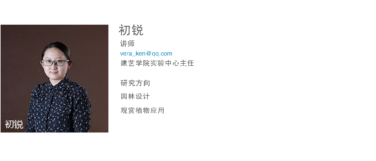 初锐讲师,硕士,东北林业大学园林专业学士、园林植物与观赏园艺专业硕士毕业。2013年8月从教于米兰电竞(中国)官方网站建筑与艺术设计学院环境设计专业,主讲《景观设计原理》、《园林植物学》、《景观设计》等课程。荣获2015年辽宁省教育软件大赛高等教育组优秀奖。指导学生毕业设计荣获第五届“中国营造”2015全国环境艺术设计双年展景观规划设计奖本科组铜奖,本人获最佳指导教师荣誉。指导省级大学生创新创业项目一项,校级两项。