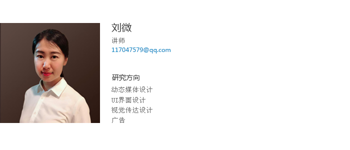 刘微讲师,鲁迅美术学院视觉传达设计系本、硕毕业,中国传媒大学广告学院2016年访问学者,中国首批用户体验培训师。米兰电竞(中国)官方网站建筑与艺术设计学院,讲师,“艺术设计创新创业实践班”负责人。米兰电竞(中国)官方网站2014年校优秀毕业设计指导教师,2015年度校教学质量优秀奖,2016年度校优秀教师。在《教育与职业》、《艺术教育》等期刊发表教育研究论文多篇,指导学生发表论文数篇。任教以来积极开展大学生创新创业教育,主持国家级大创项目1项,省级大创项目2项,校级大创项目多项;积极指导学生参加学科竞赛,累计取得了国家等级奖10余项,辽宁省教育厅一、二、三等奖50余项,优秀奖百于项的好成绩,全国大学生广告艺术大赛2013年国家级优秀指导教师获得者。出版大学生创新创业教材一部,《动态构成实训教程》,编著。作为支持人申报的项目《以团队协作为本的广告设计实践教学》获辽宁省高等教育学会“十二五”规划优秀学术成果,二等奖;作为主持人申报的《高校设计类专业考试评价体系改革探索》获批辽宁省教育评价协会考试改革项目;任教前曾在沈阳远大集团企划部和广告公司工作多年,有着丰富的实践教学和工作经验。