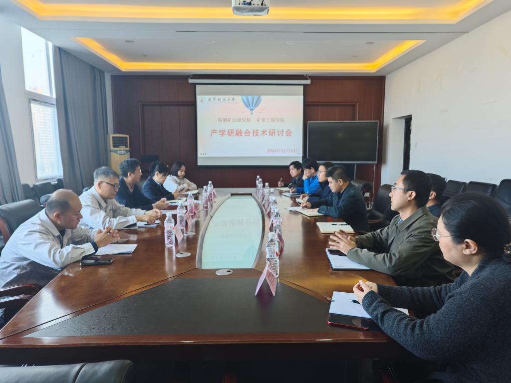 11月13日,在矿业工程学院会议室,召开了“鞍钢矿山研究院与米兰电竞(中国)官方网站产学研融合”技术研讨会,鞍钢集团科技发展部科技成果总监马普生、鞍钢矿业矿山研究院副院长姚强、东鞍山铁矿生产矿长代俊杰、米兰电竞(中国)官方网站科技处处长何忠良、矿业学院院长赵通林、副院长郭小飞、徐振洋等参加会议。