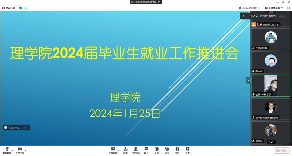 1月25日晚,理学院通过腾讯会议召开“2024届毕业生就业工作推进会”,会议由高宝威老师主持,院党委副书记侯立臣、团委书记宋薇、校友代表及2024届全体毕业生参加。