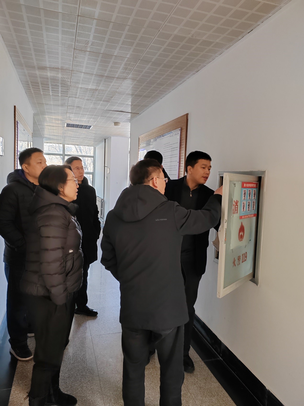 检查小组首先对明贤楼物理、光电、实验中心三部门相关实验室的灭火器和消防栓的状态、消防通道的指示牌设置情况、通道物品情况进行了检查。随后,又检查了学生工作室,对假期在校的学生提出了安全要求与提示。对假期不使用的实验室和学生工作室,封门情况及安全自查情况进行了抽检。最后,检查小组又对工程训练中心的物理实验室的消防等安全情况进行了检查。