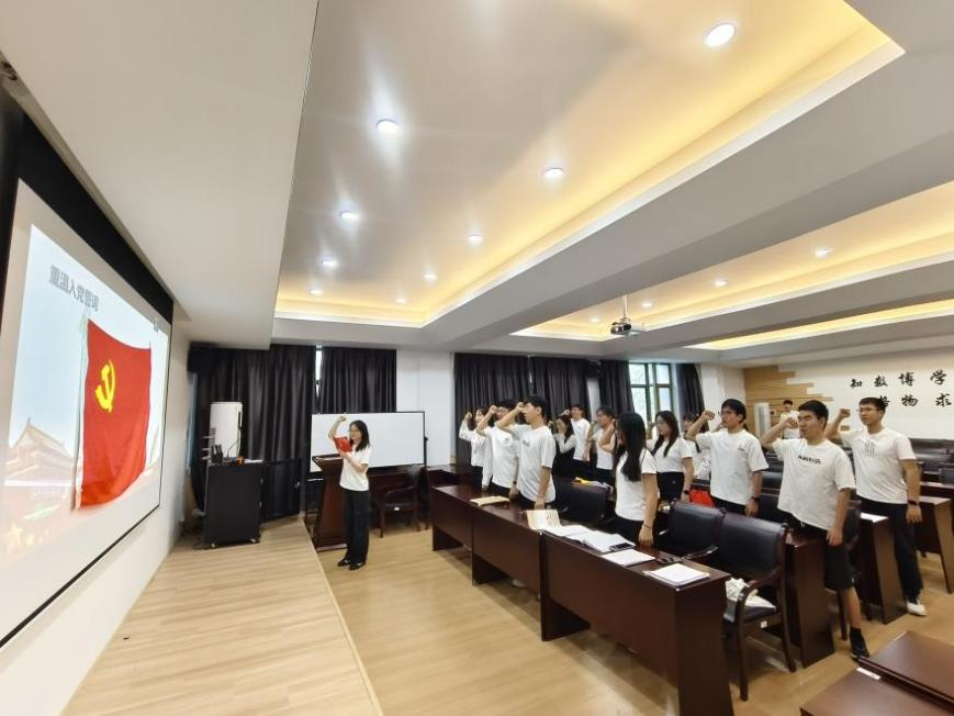 紧接着,全体毕业生党员面对党旗,重温入党誓词。誓言字字铿锵,不仅是对入党初心的回溯,更是面向未来的郑重承诺,时刻警醒着党员身份的光荣与责任。