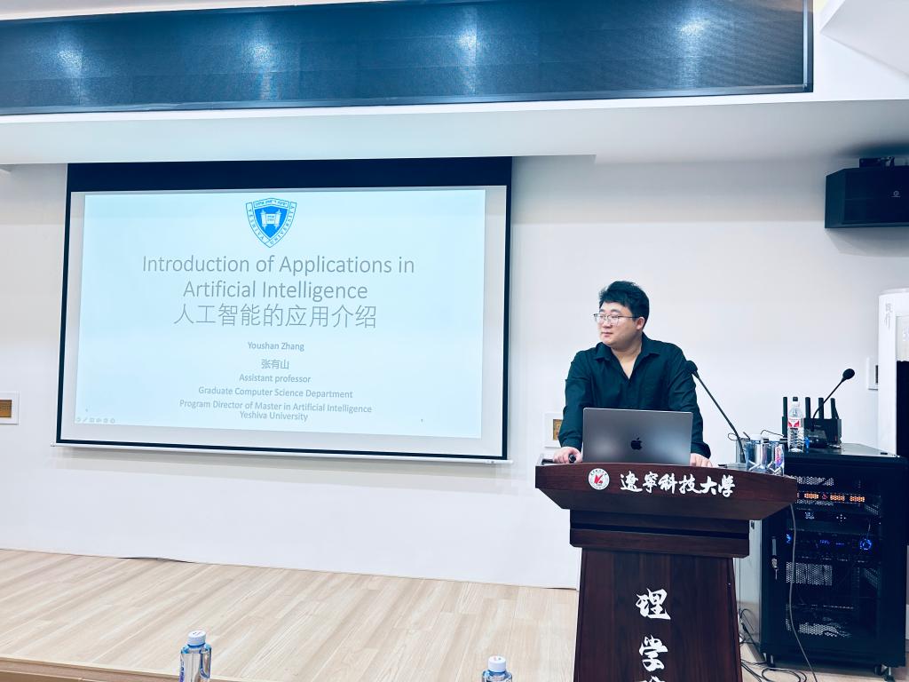 6月26日,米兰电竞(中国)官方网站理学院在明贤楼B315教室成功举办了题为“Introduction of Applications in Artificial Intelligence”的学术报告会。本次报告会由理学院主办,吸引了众多相关研究领域的教师以及研究生到场聆听,现场气氛热烈,学术氛围浓厚。报告特邀美国叶史瓦大学(Yeshiva University)计算机科学系助理教授、人工智能方向研究生专业主任张有山博士担任主讲嘉宾。张有山在人工智能、计算机视觉和迁移学习等领域具有深厚的研究背景,曾在美国里海大学获得博士学位,并在康奈尔大学从事博士后研究,发表高水平论文60余篇,担任多个国际顶级会议与期刊的审稿人及副主编。