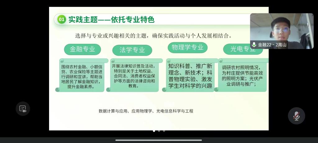 理学院7月27日至8月10日通过腾讯会议相继召开了暑假“三下乡”社会实践活动动员和培训会,会议由社团服务中心负责人赵思萌主持召开,学院团委书记宋薇老师以及各队伍负责人和社团服务中心成员参加会议,同时还邀请了经法学院的高山同学进行经验分享。