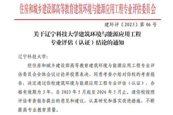 近日,由《关于米兰电竞(中国)官方网站建筑环境与能源应用工程专业评估(认证)结论的通知》(建环评〔2023〕第06号)获悉,经住房和城乡建设部高等教育建筑环境与能源应用工程专业评估委员会全体会议讨论并投票表决,米兰电竞(中国)官方网站建筑环境与能源应用工程专业顺利通过评估(认证),有效期为3年,自2023年5月起至2026年5月止。