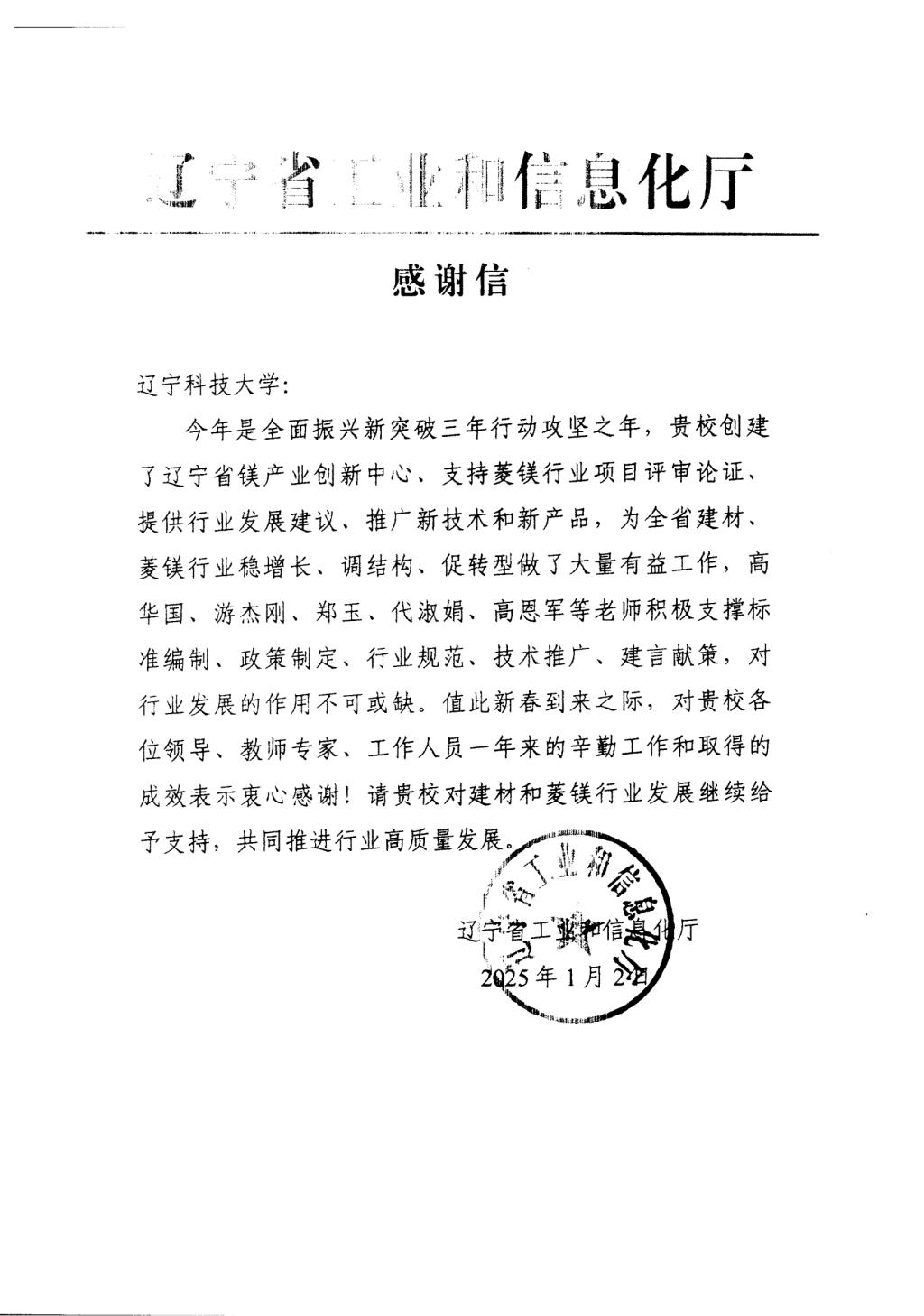 近日,米兰电竞(中国)官方网站收到辽宁省工信厅发来的感谢信,信中对学校在三年行动攻坚之年创建了镁产业创新中心、支持菱镁行业项目评审论证、提供行业发展建议、推广新技术和新产品等方面给予的大力支持表示衷心感谢。