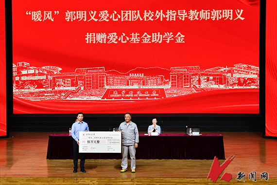 会上举行了“暖风”郭明义爱心基金发放仪式。化学工程学院辅导员、“暖风”辅导员工作室主持人曲文泉介绍了“暖风”郭明义爱心基金募集和资助情况。郭明义代表爱心基金会向学校捐赠了10万元资助金,党委学生工作部部长董文武代表学校接收了爱心基金。