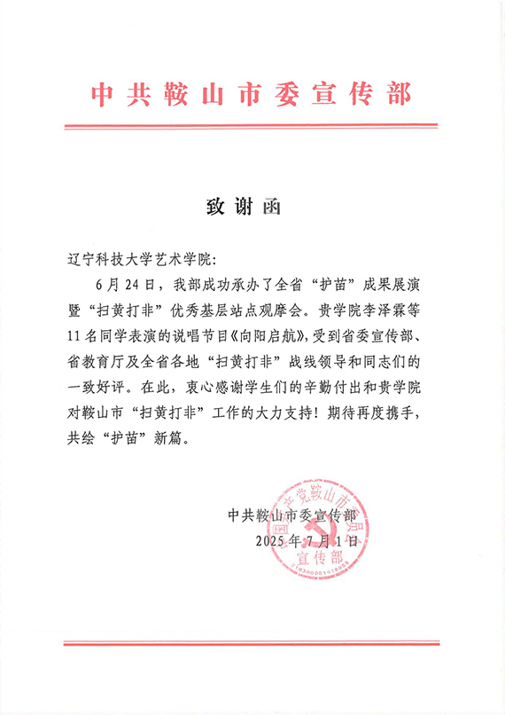 致谢函中提到,“6月24日,我部成功举办了全省‘护苗’成果展演暨‘扫黄打非’优秀基层站点观摩会。贵学院李泽霖等11名同学表演的说唱节目《向阳启航》,受到省委宣传部、省教育厅及全省各地‘扫黄打非’战线领导和同志们的一致好评。在此,衷心感谢学生们的辛勤付出和贵学院对鞍山市‘扫黄打非’工作的大力支持。”