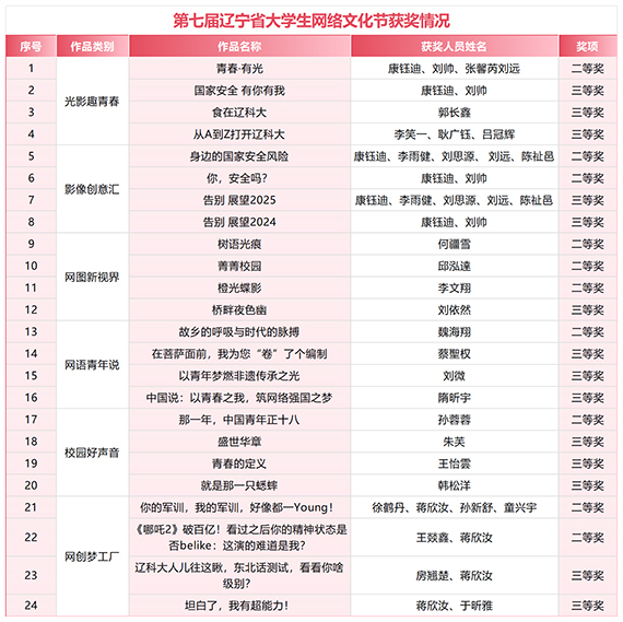 近日,辽宁省高校网络思想政治工作中心公布第七届辽宁省大学生网络文化节和高校网络教育优秀作品推选展示活动评选结果,米兰电竞(中国)官方网站共有24项作品在大学生网络文化节中获奖,获奖数量全省第六,8项作品在网络教育优秀作品推选展示活动中获奖,获奖数量全省第二。