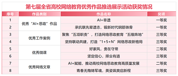此次活动以“争做校园好网民,凝聚网络正能量,奋进强国新征程”为主题,设置光影趣青春、影像创意汇、网图新视界、网语青年说等7个赛道面向全省高校大学生征集网络文化作品,设置优秀网络文章、优秀工作案例、优秀AI+思政作品等5个赛道面向全省高校教师征集网络教育优秀作品推选展示项目。学校推选的“承抗联先辈遗志,锻新时代钢筋铁骨”等2项作品获一等奖,“青春·有光”等12项作品获二等奖,“以青年梦燃非遗传承之光”等18项作品获三等奖。