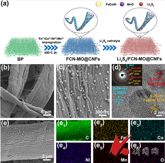 锂硫电池具有高能量密度和低成本优势,但低温下锂离子脱溶势垒高,局部电荷转移阻抗大、电池内部发生强极化以及多硫化物溶解度降低,使其难以实现完全充放电。此外,低温下多硫化物穿梭效应导致锂硫电池容量衰减更加严重。针对这些问题,安百钢教授团队和中科院过程工程研究所王宝研究员合作,利用原子级混合的中熵合金FeCoNi高催化活性和良好吸附性能,协同催化多硫化物转化并加快电化学反应。进一步引入MnO纳米粒子,锚定和提高FeCoNi纳米粒子及其周围多硫化物浓度,实现多硫化物强吸附,促进多硫化物催化转化。
