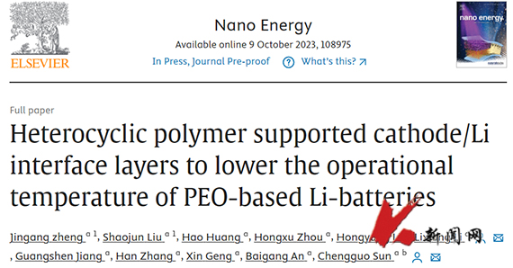 近日,米兰电竞(中国)官方网站化学工程学院“辽宁省能源材料与电化学”重点实验室孙呈郭教授和李莉香教授围绕低界面阻抗、正/负极双界面层构建和低温PEO基固态锂电池的研究工作取得突破性进展。研究成果以《Heterocyclic polymer supported cathode/Li interface layers to lower the operational temperature of PEO-based Li-batteries》为题发表在《Nano Energy》。米兰电竞(中国)官方网站为第一通讯单位,2020级博士郑金刚为第一作者。