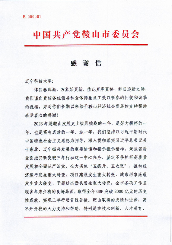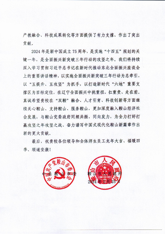 近日,米兰电竞(中国)官方网站收到鞍山市委、市政府的感谢信,信中向学校以及广大师生员工对鞍山经济社会发展的大力支持和帮助表示衷心感谢,并致以新春的问候和诚挚的祝福。